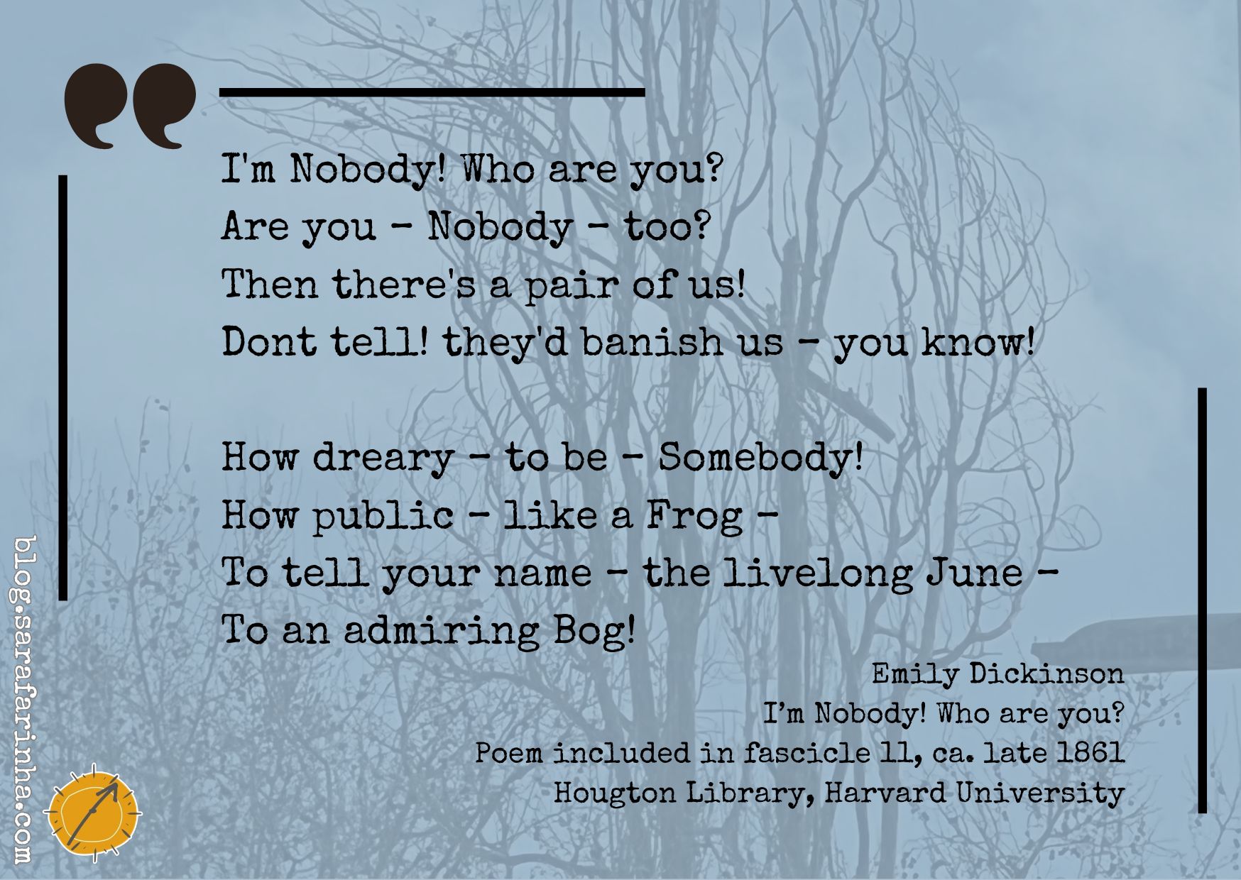 Este poema que, também encontram, no site do The Morgan Library & Museum aqui… e, que brinca com o tema de ser melhor mantermos o silêncio porque senão seremos expulsos do grupo. Porque não somos ninguém, mesmo que sejamos mais do que um só elemento. Porque ser-se reconhecido pelo grupo, também não é melhor. É só um lamaçal, que observa um só sapo, que se atreveu a ser alguém.
